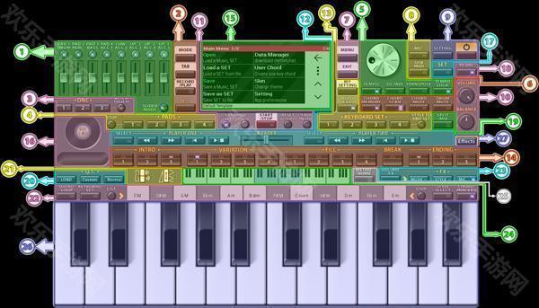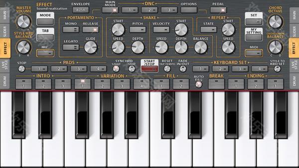 4、使用以下方式模拟KORG键盘:淡入淡出,同步,键盘设置,速度,移调,八度,平衡,音调,分割,和弦记忆,点击速度/重置……